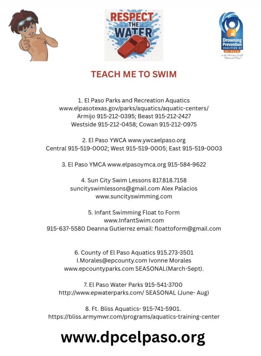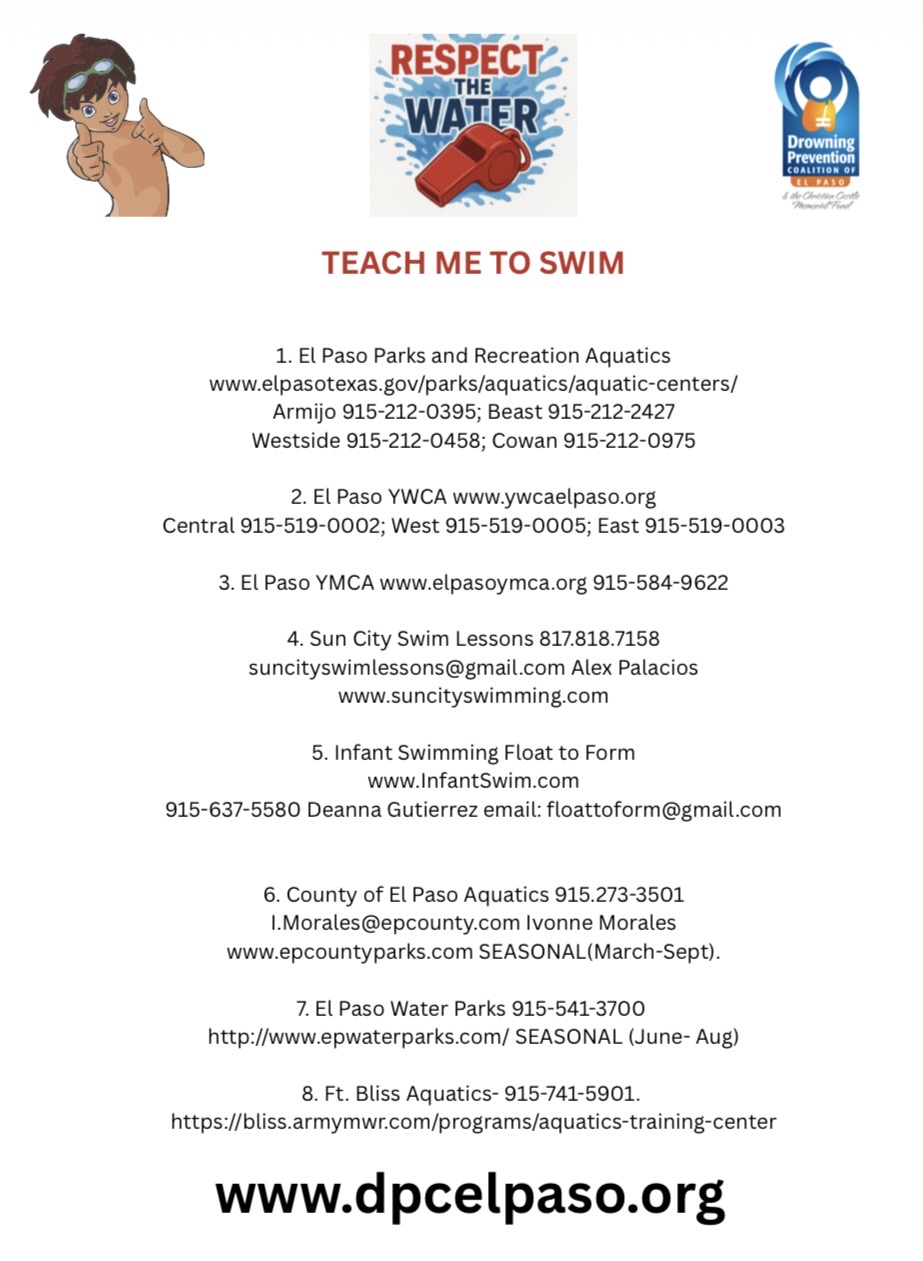 The Drowning Prevention Coalition of El Paso each year hosts Drowning Prevention Week as a way to reach out to area school students, teachers and parents about the importance of water safety, learning to swim and the importance of these three simple yet powerful words, “Respect the Water”.