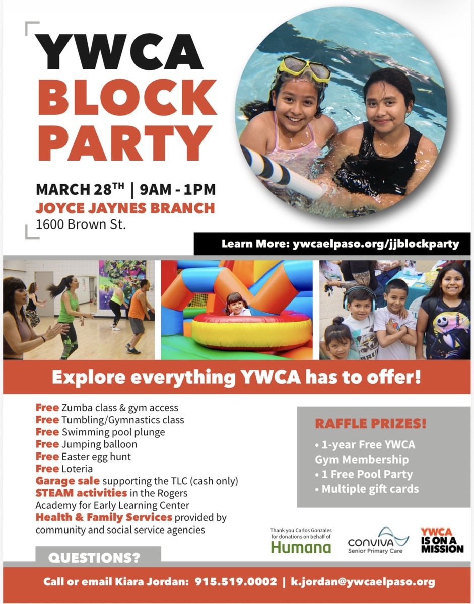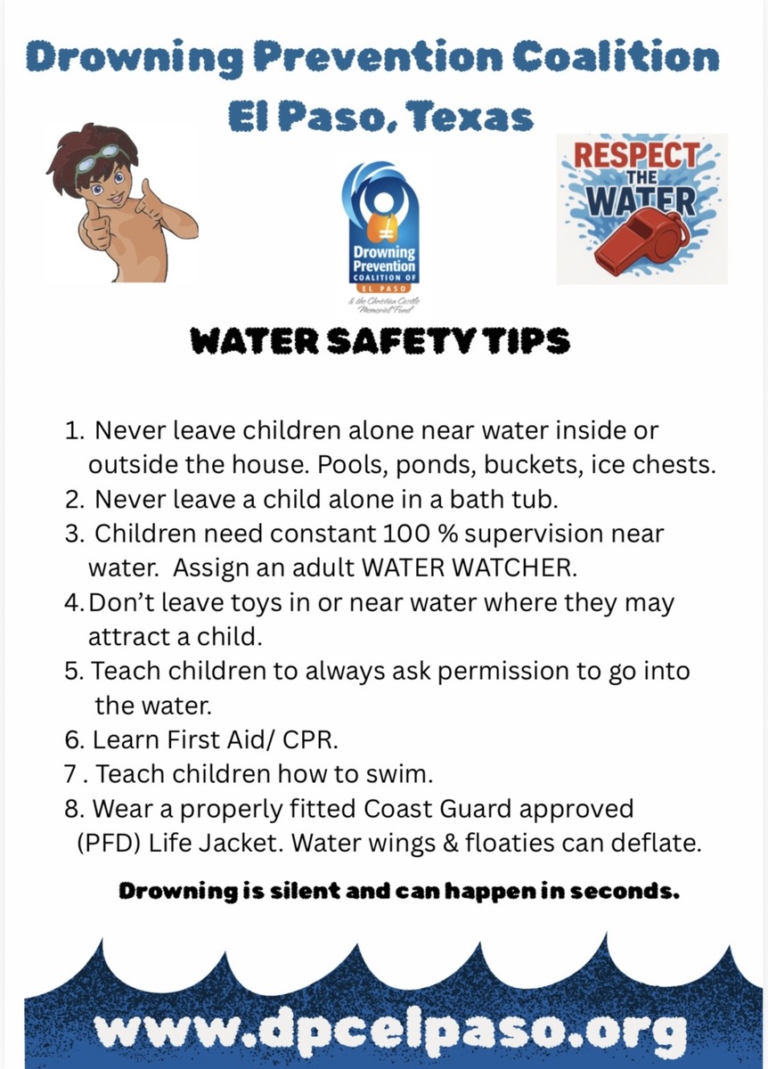 The Drowning Prevention Coalition of El Paso will be participating in the YWCA Block Party on March 28, 2026 from 9 am-1 pm. Come by our booth and learn about WATER SAFETY/DROWNING PREVENTION. Pick up a FREE WATER WATCHER CARD to use while children are in or near the water.